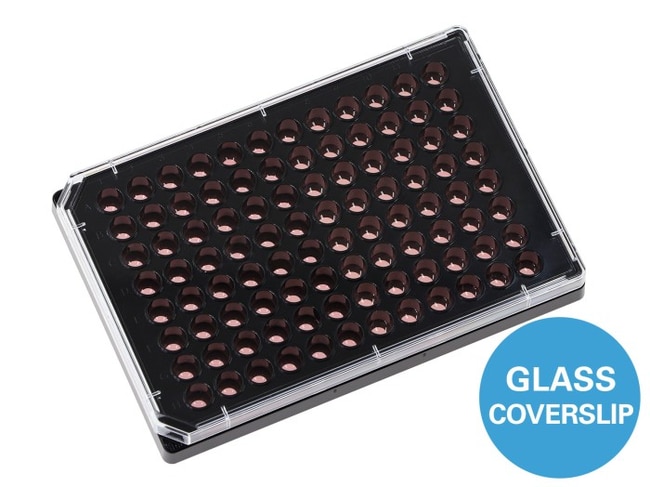 The ibidi product family is comprised of a variety of ¿-Slides and ¿-Dishes, and ¿-Plates which have all been designed for high-end microscopic analysis of fixed or living cells. The high optical quality of the polymer material is similar to that of glass. This allows the researcher to perform a wide variety of fluorescence experiments with uncompromised resolution and choice of wavelength. The ¿-Plate 96 Well Black Round allows you to perform high resolution microscopy in a standard multi-well format. The ibidi ¿-Plate 96 Well Black is made out of a black polymer to eliminate well-to-well crosstalk during fluorescence microscopy. #1.5H (170 µm +/- 5 µm) D 263 M Schott glass, sterilized