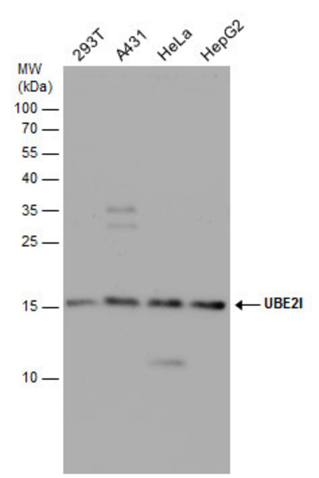 | Recombinant protein encompassing a sequence within the center region of human UBE2I. The exact sequence is proprietary. | |