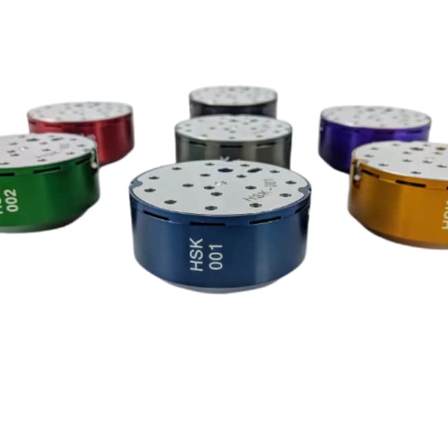 The Universal V1-Puck (Uni-Puck) Set of 7 provides a versatile solution for sample pin storage and shipping, compatible with many automated sample mounting systems. This set includes seven V1-Pucks, with one puck of each color: Black, Red, Orange, Green, Blue, Purple, and Grey, aiding in visual organization. Each individual V1-Puck offers robust protection for cryogenic samples, securely holding up to 16 sample bases or pins in its dedicated ports. Consisting of two main parts, each component features a unique serial number for identification, facilitating precise sample tracking. When ordering, please provide your desired color selection and engraving of up to 8 characters, i.e. ABCD-#### in sequence starting at '1'.