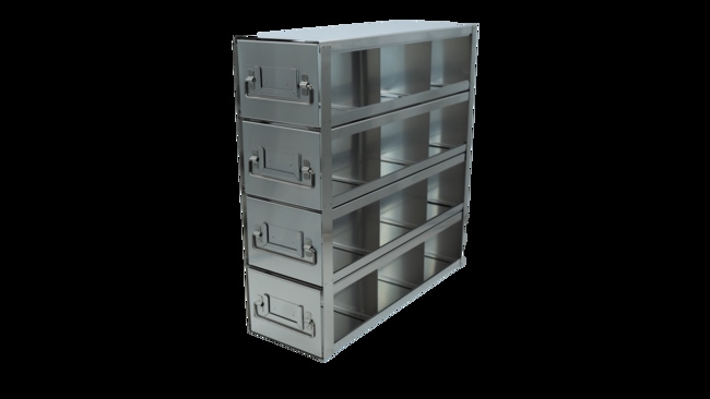 CRYSTAL TECHNOLOGY AND INDUSTRIES Upright Drawer Style Freezer Rack, Holds (12) Large 3.75" Boxes, Rack Dims 18 7/16L x 16 11/16H x 6 1/8W" (459 x 424 x 155mm) Compartment Dims 5 7/8L x 3 15/16H x 5 13/16W" (149 x 100 x 148mm) 3x4