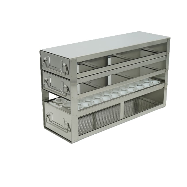 For 2 ” Boxes, 15ml & 50ml Centrifuge Tube Upright Combination Drawer Freezer Racks conveniently stores 2” Fiberboard boxes and 50ml centrifuge tubes. These high-quality racks are constructed of corrosion resistant stainless steel and include handles and identification card holders. Security lock devices are also available for each rack though ordered separately. This freezer rack does not come standard with boxes or tubes. Dimensions L x H x W : 16 11/16 x 9 11/16 x 5 1/2 inch (424 x 246 x 140mm)Compartment Size: L x H x W : 5 3/8 x 2 1/8 x 5 1/4 (137 x 54.4 x 133mm)