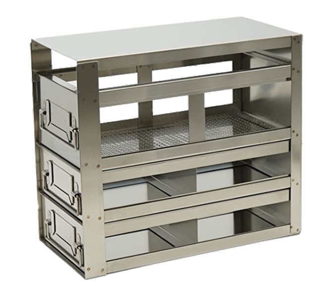 For 2 ” Boxes, 15ml & 50ml Centrifuge Tube The UFDR-B-222 Combination Drawer freezer Racks conveniently stores up to (4) 2 inch boxes and multiple storage bottles. These high-quality freezer racks are constructed of corrosion resistant stainless steel, include handles and identification card holders. Security lock devices are also available for each rack though ordered separately. Boxes & storage bottles are not included with purchase. Dimension LxHxW:11 5/16 x 9 11/16 x 5 1/2 inch (287 x246 x 140 mm)Compartment Size lxhxw: 5 3/8 x 2 1/8 x 5 1 /4 inch (137 x 54.4 x 133mm)