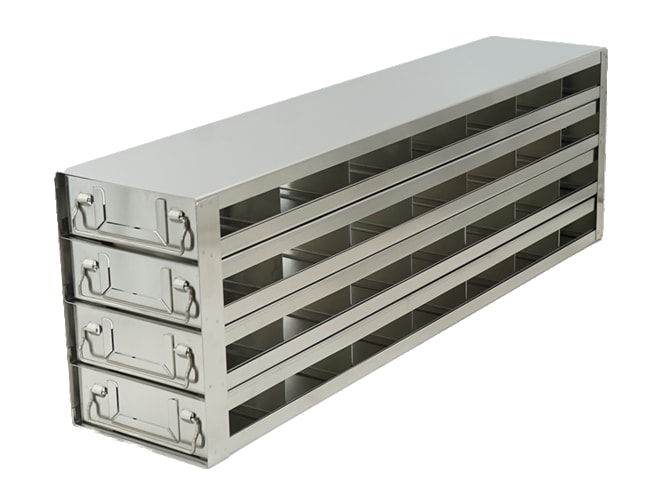 For 96 Deep-Well Microtiter PlatesFor Speciality Tube Racks (Matrix, Micronic,Fluidx) H: 9/16″-1 3/4″ (14.4-44.9mm) Our Upright Freezer Drawer Racks are constructed of high-quality, corrosion resistant stainless steel. Durable stainless steel freezer racks facilitate organization and maximize valuable storage space.. Handles at both ends accommodate freezers with right or left handed doors. Racks are for 96 Deep-Well Microtiter Boxes. Our freezer racks have been configured to fit all major ultra low (-80°) freezers on the market; racks are designed for ultra low upright freezers. Dimensions (DxWxH): 25 3/16 x 5 7/16 x 8 1/16 inches (640 x 138 x 205mm)Compartment Dimensions (l x h x w): 3 1/2 x 1 3/4 x 5 1/8 inch (89.4 x 45.4 x 130mm)