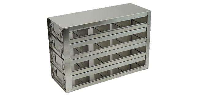 For 96-Well and 384-Well Microtiter PlatesFor Speciality Tube Racks (Matrix, Micronic, Fluidx, Abgene) H: 11/16″-2 1/8″ (17.3-53.5mm) Upright Freezer Drawer Racks allow for storage of 16 total 96/384-Well Microtiter Plates, Microtube Boxes or Micronic ROBO Racks. These freezer racks are constructed of corrosion resistant stainless steel. Racks include handles and identification card holders for easy access and identification. The drawer style rack design allows easy access to fewer microtiter plates at a time thus protecting other samples in the rack from warming up Plate Capacity: 48 with lids 64 without lids 4×4 Configuration Dimensions (DxWxH): 14 5/8 x 5 7/16 x 9 3/4 inches (372 x 138 x 247mm)Compartment Dimensions: 3 1/2 x 5 1/8 x 2 3/16 inches (89 x 130 x 55.8mm) **Lock device is ordered separately.