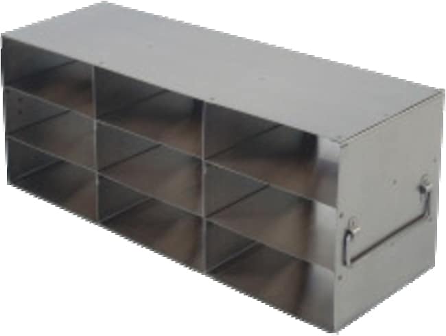 For Large 2″ Cardboard Boxes and 100-Cell Hinged Top Plastic Storage Boxes Upright freezer racks for storage of 100-cell hinged top boxes, features 3 boxes deep by 3 boxes high configuration for a total of 9 boxes. These upright freezer racks are built with durable, corrosion resistant stainless steel. Each rack includes handles for easy retrieval from a laboratory freezer. Dimensions (DxWxH): 19 3/16 x 5 7/8 x 6 15/16 inches (488 x 149 x 176mm)Compartment Dimensions: 6 1/8 x 5 13/16 x 2 5/16 inches (156 x 147.5 x 57.6mm) *Lock device is ordered separately.