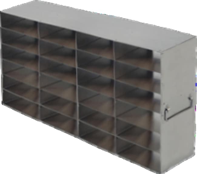 For Large 2″ Cardboard Boxes and 100-Cell Hinged Top Plastic Storage Boxes Upright freezer racks for storage of 100-cell hinged top boxes, features 4 boxes deep by 6 boxes high configuration for a total of 24 boxes. These upright freezer racks are built with durable, corrosion resistant stainless steel. Each rack includes handles for easy retrieval from a laboratory freezer. Dimensions (DxWxH): 25 7/16 x 5 7/8 x 13 13/16 inches (646 x 149 x 351mm)Compartment Dimensions: 6 1/8 x 5 13/16 x 2 5/16 inches (156 x 147.5 x 57.6mm)