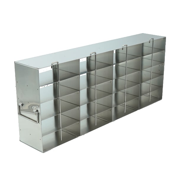 For 96 Deep-Well Microtiter PlatesFor Speciality Tube Racks (Matrix, Fluidx, Micronic)- H: 9/16″- 1 3/4″ (14.4-44.32mm) 4×5 Configuration Upright freezer racks are designed for storage of 96 Deep-Well Microtiter Plates and Microtube Racks. This freezer rack features a 4 high by 5 deep configuration for a total storage of 20 plates or microtube racks. These high-quality upright freezer racks include handles, are constructed of corrosion resistant stainless steel and offer convenient storage of samples in an organized format. Each rack compartment holds a single 96 deep-well microtiter plate or microtube rack/box. A locking rod is included with this freezer rack to provide added security to prevent plates or boxes from sliding out of the rack when moving the racks in and out of the freezer. Dimensions (DxWxH): 15 3/16 x 5 1/2 x 9 3/8 inches (385.3 x 140 x 237.5mm)Compartment Dimensions: 3 9/16 x 5 3/16 x 1 13/16 inches (91 x 130.5 x 45.7mm)