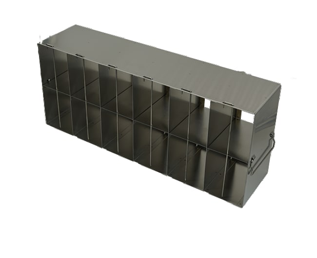 96-Well and 384-Well Microtiter Plates Upright Freezer Racks are designed for storage of 96 & 384-Well Microtiter Plates and can store up to 96 plates. These freezer racks are constructed of corrosion resistant stainless steel, include handles, and offer convenient storage of microtiter plates in your laboratory freezer. Locking rods are also included for added security. Microtiter plates are not included with purchase. Plate Capacity: 84 with lids 96 without lids Dimensions (DxWxH): 22 1/2 x 5 1/2 x 9 3/16 inches (571 x 140 x 233mm)Compartment Dimensions: 3 9/16 x 5 3/16 x 4 1/2 inches (91 x 130.5 x 115mm) .*Lock device is ordered separately.