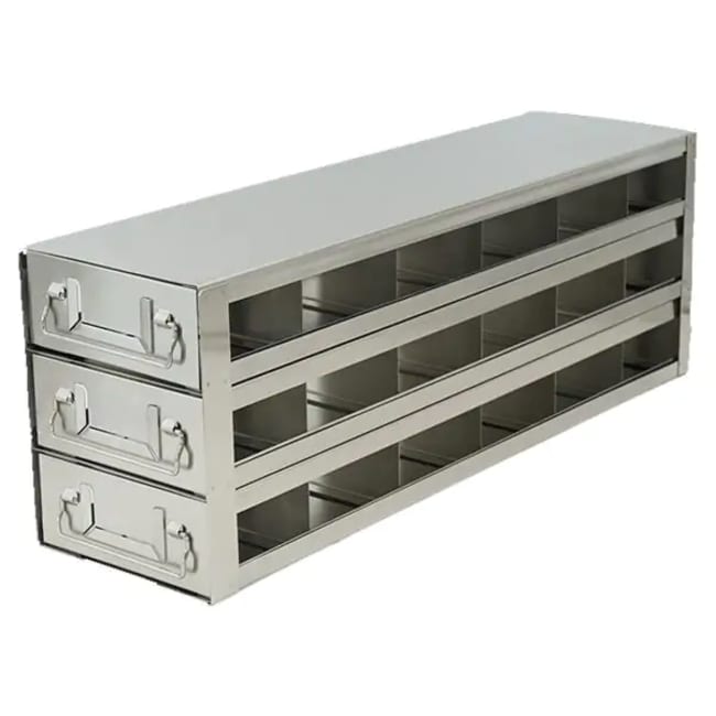 For 50-Cell Hinged Top Plastic Boxes The Alkali Scientific™ Upright Stainless Steel Freezer Rack is an essential storage solution engineered to optimize the organization and accessibility of samples stored in 50-cell hinged top plastic boxes within upright freezers. This drawer rack system is designed to enhance the efficiency and capacity of sample storage, making it an invaluable tool for laboratories seeking to maintain high standards of sample integrity and organization Dimensions L x H x W: 21 7/16 x 10 1/16 x 5 7/8 Inch (545 x 256 x 150mm)Compartment Size l x h x w: 3 1/2 x 2 5/16 x 5 9/16 Inch (88.5 x 58 x 142mm)