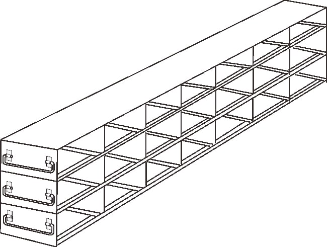 For 50-Cell Hinged Top Plastic Boxes The Alkali Scientific™ Upright Stainless Steel Freezer Rack is an essential storage solution engineered to optimize the organization and accessibility of samples stored in 50-cell hinged top plastic boxes within upright freezers. This drawer rack system is designed to enhance the efficiency and capacity of sample storage, making it an invaluable tool for laboratories seeking to maintain high standards of sample integrity and organization Dimensions L x H x W: 24 15/16 x 12 5/8 x 5 7/8 Inch (634 x 320 x 150mm)Compartment Size l x h x w: 3 1/2 x 2 5/16 x 5 9/16 Inch (88.5 x 58 x 142mm)