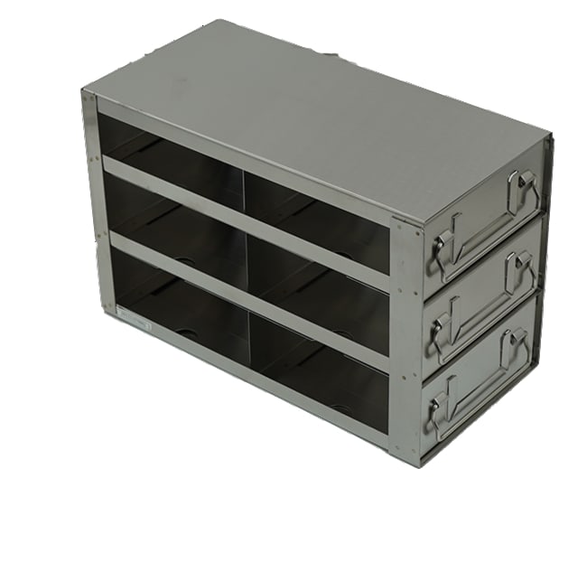 For Standard 2″ Boxes Our Stainless Steel Freezer Racks with Drawers in a 2 x 3 configuration provides an enhanced storage solution designed for efficiency and ease of use in ultra-low temperature environments. With a capacity to hold 6 standard 2" boxes, these racks are crafted from high-quality, corrosion-resistant stainless steel, ensuring durability and longevity under the rigorous conditions of ultra-low (-80°C) freezers. Designed for ultra-low upright freezers, these racks feature a drawer system that greatly facilitates the organization, access, and retrieval of samples. Dimensions (DxHxW): 11 7/16 x 7 1/8 x 5 1/2 inches (290 x 181 x 140mm)Compartment Dimensions d x h x w: 5 3/8 x 2 1/8 x 5 1/4 inches (137.4 x 54.4 x 133 mm)