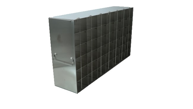 For 50-Cell Hinged Top Plastic Boxes The Alkali Scientific™ Upright Stainless Steel Freezer Rack (UFH50-76) for 50-Cell Hinged Top Plastic Boxes is a premium storage solution designed to provide unparalleled organization and accessibility for samples stored in 50-cell hinged top plastic boxes within upright freezer environments. Crafted from high-quality stainless steel, this freezer rack combines durability with efficient space management, making it an ideal choice for laboratories seeking to optimize their cold storage practices. Dimensions (DxWxH): 26 1/8 x 5 7/8 x 14 1/8 inches (664 x 150 x 359mm)Compartment Dimensions:3 9/16 x 2 5/16 x 5 9/16 inch (91 x 58 x 142mm)