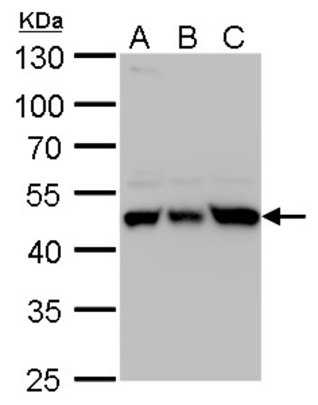 Keep as concentrated solution. Predicted reactivity: Mouse (88%), Rat (87%), Rhesus Monkey (97%), Chimpanzee (100%), Bovine (88%). Positive Control: 293T, A431, HeLa, HepG2, A375, Huh7, Hep3B. Store product as a concentrated solution. Centrifuge briefly prior to opening the vial.