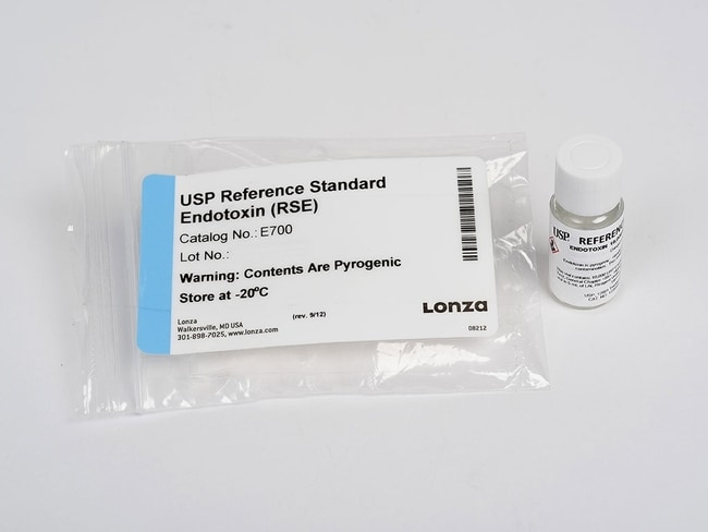 Each vial of Reference Standard Endotoxin (RSE) contains 10,000 EU/vial.Update:The United States Pharmacopeia (USP) has begun distributing a new lot of Reference Standard Endotoxin (RSE). As a result you may notice some changes in the E700 product you purchase from Lonza. In addition to the lot number of the vial being different, you may also notice a change in vial closure. The previous RSE lot was provided in a glass vial which was stoppered and crimped. The new lot is supplied in a glass vial which is stoppered and capped with a white screw cap.The storage and shipping conditions of the RSE are also changing. Previously E700 was stored and shipped under refrigerated conditions. Following the recommendations made in the study report entitled “Collaborative Study for the Establishment of the WHO 3rd IS for Endotoxin, the Ph. Eur. Endotoxin Standard BRP batch 5 and the USP RS for Endotoxin lot H (BSP111)”, E700 will now be distributed and stored frozen. Content:1 vial
