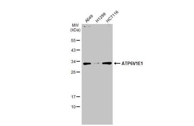 | Recombinant protein encompassing a sequence within the center region of human ATP6V1E1. The exact sequence is proprietary. | |