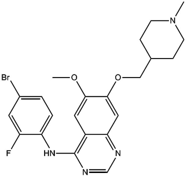 Vandetanib (ZD6474 CAS 443913-73-3) is a small molecule inhibitor targeting both vascular endothelial growth factor receptor 2 (VEGFR-2) and epidermal growth factor receptor (EGFR) tyrosine kinases with IC50 values of 40 nM and 500 nM respectively In biochemical assays vandetanib displays stronger inhibitory activity toward VEGFR-2 compared to VEGFR-3 and VEGFR-1 In human umbilical vein endothelial cells it suppresses VEGF- and EGF-induced proliferation with IC50 values of 60 nM and 170 nM respectively Vandetanib has been shown to inhibit the growth of various cancer cell lines and to reduce tumor progression in xenograft models supporting its utility in studies of angiogenesis and targeted cancer therapies
