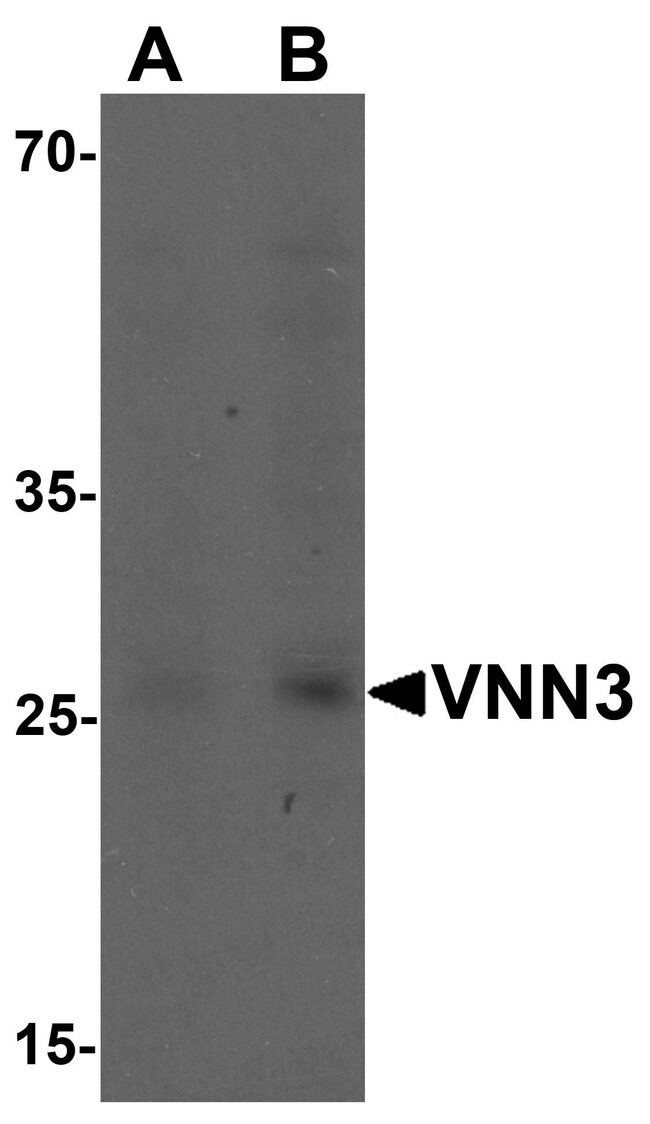 The vanin family is a novel group of ectoenzymes that function in tissue repair and plays a role in oxidative-stress response. As both secreted and membrane proteins, the vanin family members have been implicated as therapeutic targets in inflammatory disease. VNN3 (vascular non-inflammatory molecule 3), also known as Vanin3, is a 501 amino acid GPI-anchored amidohydrolase that is widely expressed and is found at highest levels in blood and liver. Induced by Th17 / Th1 type cytokines, VNN3 converts pantetheine into pantothenic acid. Containing one CN hydrolase domain, VNN3 is encoded by a gene that maps to human chromosome 6q23.2.