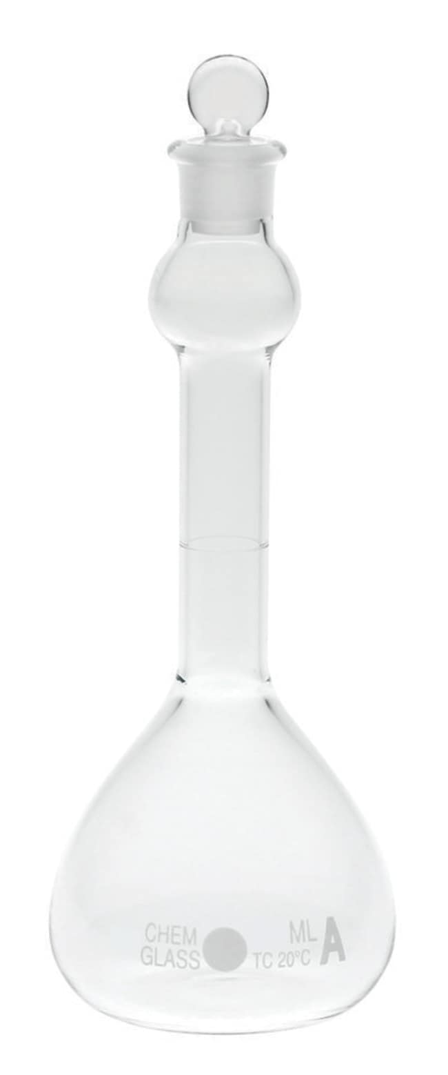 2000mL Volumetric Flask, Class A, #27 Outer Stopper Neck, Mixing Bulb. Similar to CG-1600 but with the addition of a mixing bulb between the calibration line and the stopper. The mixing bulb contains approximately one tenth of the flask capacity and aids in the mixing or dissolving of the flask contents. Supplied complete with one solid glass pennyhead stopper. For additional stoppers, see CG-3018.