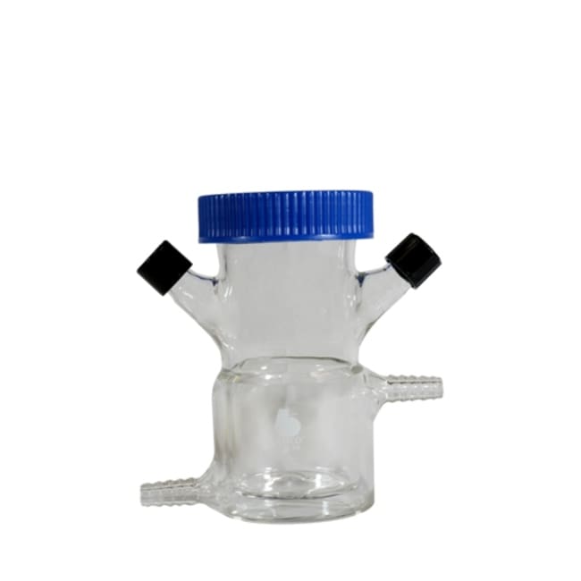 For use circulating water bath or chiller and magnetic stir plate. Hose connection accepts 3/8" id silicone tubing (bellco m7965037) available complete with micro-carrier impeller assembly or as components. Jacket volume (ml): 100ml Cap size: 70mm