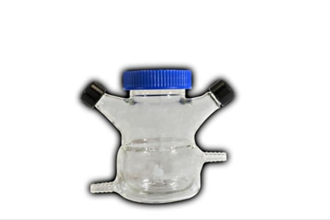 For use circulating water bath or chiller and magnetic stir plate. Hose connection accepts 3/8" id silicone tubing (bellco m7965037) available complete with micro-carrier impeller assembly or as components. Jacket volume (ml): 250ml Cap size: 70mm
