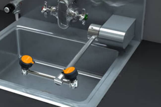 AutoFlow™ eyewash for mounting on wall. Spray heads swing down from storage to operational position, activating water flow. Available in a variety of spray head configurations to minimize obstructions at a sink. Note: If unit is not installed at a sink, floor drain should be provided underneath unit to prevent accumulation of water on floor.