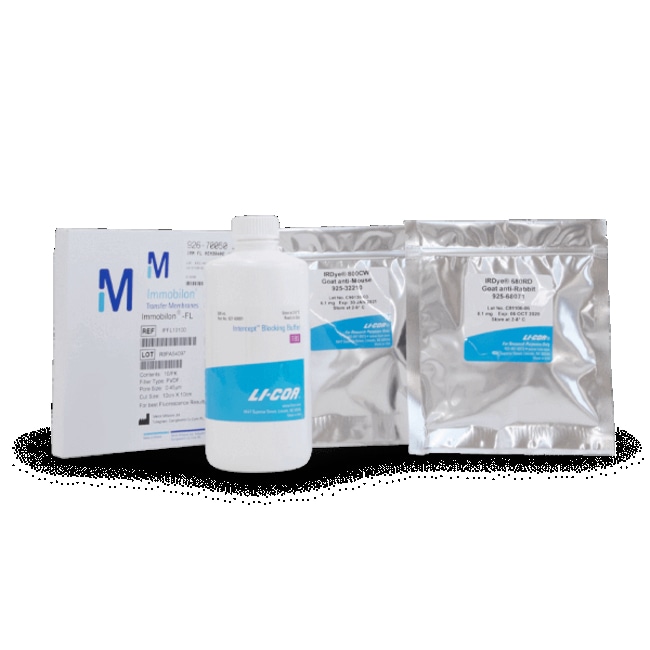 This kit contains IRDye 800CW Goat anti-Mouse Secondary Antibody (0.1 mg, 1 mg/mL), IRDye 680RD Goat anti-Rabbit Secondary Antibody (0.1 mg, 1 mg/mL), 500 mL Intercept (TBS) Blocking Buffer, and 10 Immobilon-FL PVDF Membranes (0.45 µm, 10 cm x 10 cm)