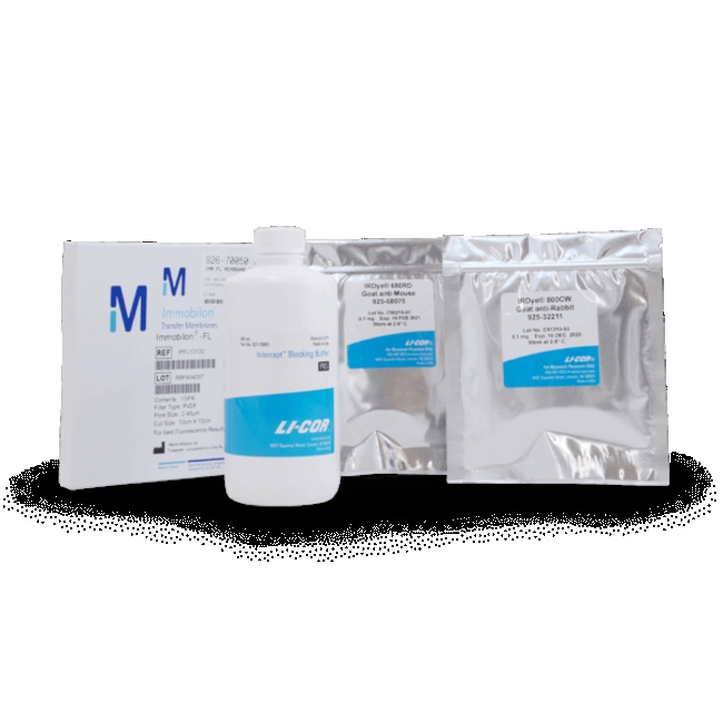 This kit contains IRDye 800CW Goat anti-Rabbit Secondary Antibody (0.1 mg, 1 mg/mL), IRDye 680RD Goat anti-Mouse Secondary Antibody (0.1 mg, 1 mg/mL), 500 mL Intercept (PBS) Blocking Buffer, and 10 Immobilon-FL PVDF Membranes (0.45 µm, 10 cm x 10 cm)