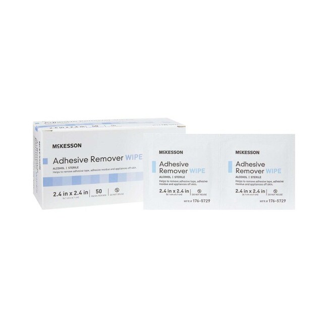 Adhesive Remover McKesson Wipe 50 per Box Helps to remove adhesive tape, adhesive residue and pouches from skin Cleanses skin and removes adhesives and debris from peristomal skin Gentle, alcohol-based formula Packaged in convenient, individually wrapped packets