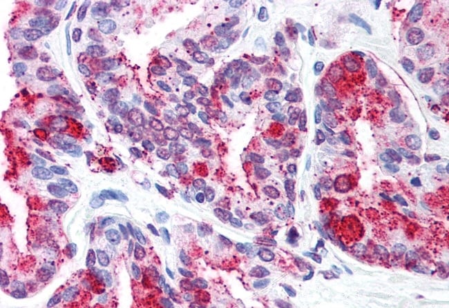 Percent identity with other species by BLAST analysis: Human, Orangutan, Gibbon, Monkey (100%); Gorilla, Marmoset (93%); Dog, Elephant, Horse, Rabbit, Opossum (86%). For IHC(P), use heat induced antigen retrieval in pH 6.0 citrate buffer. After incubation with the primary antibody, slides were incubated with biotinylated secondary antibody, followed by alkaline phosphatase-streptavidin and chromogen.