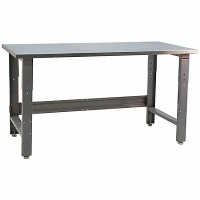 The Workbench SS 72"W x 30"D is a stainless steel workbench that provides a durable and corrosion resistant work surface. It has an open base design with adjustable leveling feet. The workbench features a 1-1/4" thick maple butcher block top that measures 72" wide by 30" deep, providing ample workspace. The height of the workbench is adjustable from 30" up to 37". This industrial grade workbench is made in the USA and can support up to 3000 lbs. Its stainless steel construction makes it ideal for use in wet, high traffic areas. The open base allows for easy cleanability.