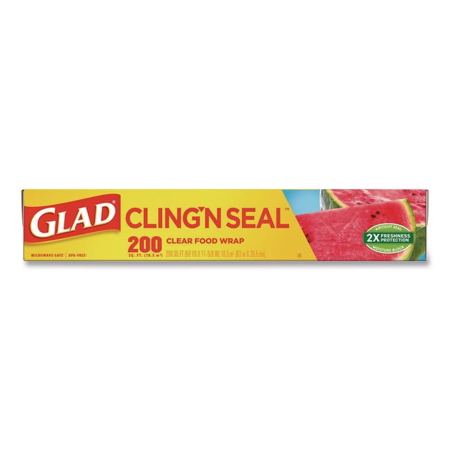 Glad ClingWrap extends your food s freshness by keeping air out with a superior seal cling versus the national brand With 3X the freshness based on moisture loss in produce versus no protection keep your foods fresher longer Its easy-to-use roll makes protecting your favorite foods fast and simple This food wrap is easy to handle and grips to a variety of surfaces such as glass and metal making it useful for portioning preparing steaming and protecting ClingWrap can be used outside of the kitchen too It is great to use for preventing leaks in toiletries when traveling wrapping wet paint brushes to use later or keeping items in drawers when moving Glad ClingWrap contains no plasticizer and is BPA free and microwave safe Ideal for use in restaurants cafeterias and other food service facilities Glad protects and seals with ease 200 sq ft Material(s)- Plastic Length- 69 yd Width- 11 62 Product Packaging- Box