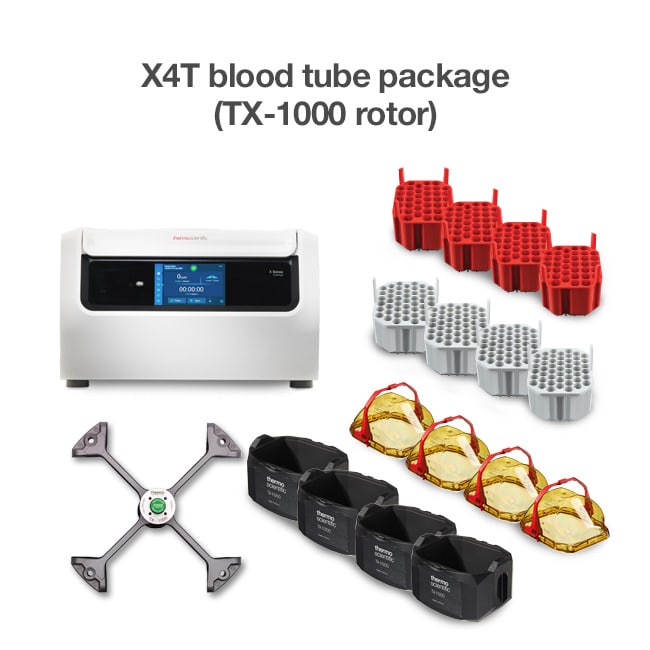 Thermo Scientific X4T Ventilated Centrifuges offer high performance and versatility with an easy-to-use, full-color touchscreen user interface. The centrifuges make programming easy for quick results and allow easy access to track runs, rotor life, and centrifuge health. With up to 4 L capacity, they allow spinning 196 blood tubes, 40 x 50 mL conical tubes and 96 x 15 mL conical tubes. Maximum versatility is achieved with 18 available rotors to choose from and Thermo Scientific Auto-Lock Rotor Exchange to quickly change between applications. Available for purchase individually or in convenient application-based packages. Cell culture packages include the centrifuge, rotor, Thermo Scientific ClickSeal Biocontainment Lids and a set of four 15 mL and 50 mL conical tube adapters. Blood processing packages include the centrifuge, rotor, ClickSeal biocontainment lids and a set of four 5/7 mL and 9/10 mL blood tube adapters.