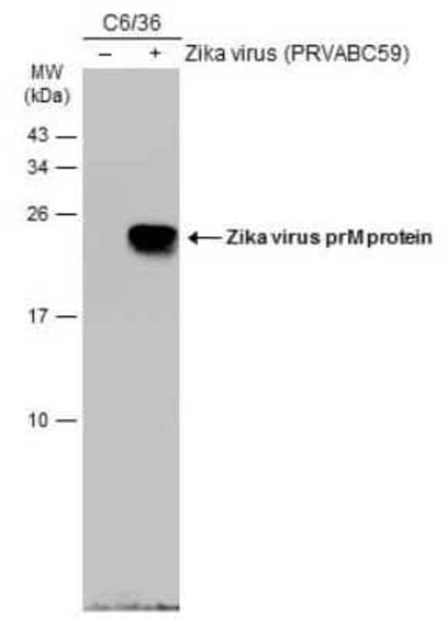 Zika virus prM Polyclonal antibody specifically detects Zika virus prM in Virus samples. It is validated for Western Blot, ImmunofluorescenceSpecifications