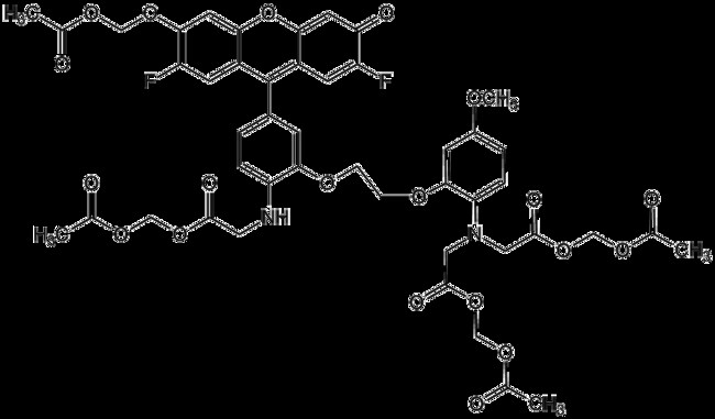 Chemical. CAS: 562102-46-9. Formula: C46H44F2N2O20. MW: 982.85. Synthetic. Zin3 AM is a cell-permeable Zn2+-selective indicator (Absorption=456nm), that once it enters the cell is hydrolized by esterases to convert the bright fluorescent Zin3 (Ex/Em: ~494/516nm). Zin3 is suitable for detection of Zn2+ concentrations in the 1–100 nM range and it has shown to be very Zn2+-sensitive and Zn2+-specific. The cell permeant AM-ester is useful for detecting low intracellular Zn2+ levels and small concentration changes. Zin3 exhibits high Zn2+-binding affinity that is unperturbed by Ca2+ concentrations up to at least 1 µM (Kd (Zn2+) (in buffer): ~15nM). In addition, Zin3 exhibits a >50-fold increase in fluorescence in response to saturating levels of Zn2+. This dye is usedpredominantly for imaging applications, but has also used in cell-based microplate assays and flow cytometry protocols. The product is typically loaded into cells by adding the dissolved indicator to medium containing cells.