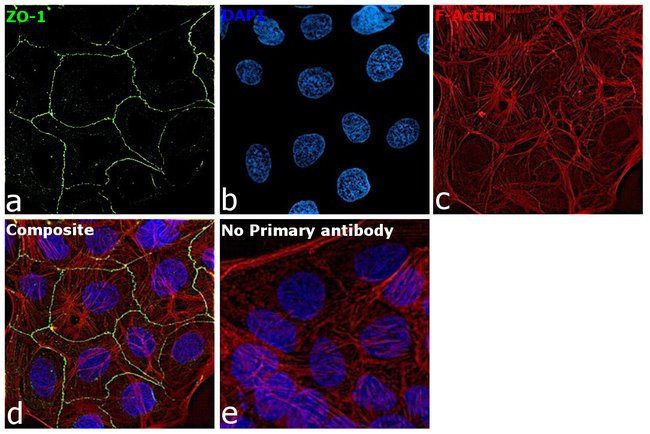 ZO-1 forms complexes with either ZO-2 or ZO-3. In addition, these proteins can also associate with claudin, occludin and F-actin, at tight junction stands, where they provide a linkage between the actin cytoskeleton and the tight junction. ZO-1 expression is significantly reduced in many breast cancer lines. ZO-2 and ZO-3 are ubiquitously expressed within epithelial tight junctions, and unlike ZO-1, which is also expressed at cell junctions of cardiac myocytes, ZO-2 is not expressed in nonepithelial tissue. ZO-1 is a protein located on a cytoplasmic membrane surface of intercellular tight junctions. ZO-1 may be involved in signal transduction at cell-cell junctions. Two transcript variants encoding distinct isoforms have been identified for the ZO-1 gene. Diseases associated with ZO-1 dysfunction include Celiac Disease and Congenital Nephrotic Syndrome.