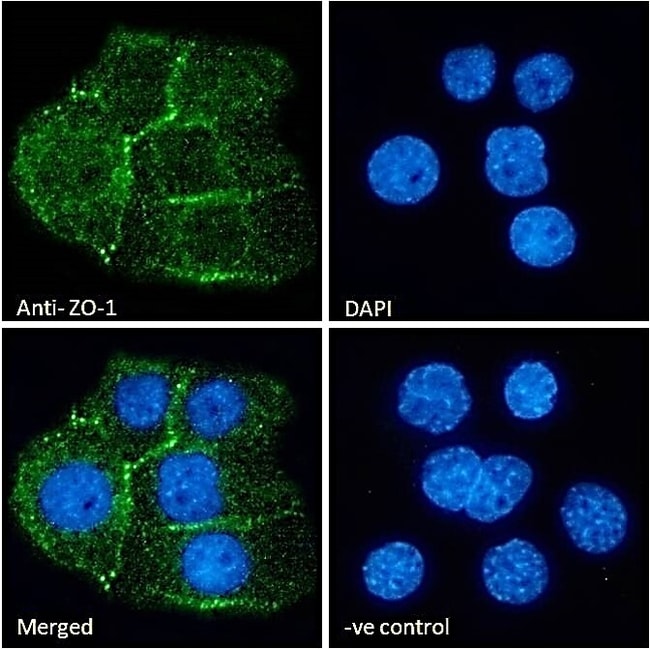 ZO-1 forms complexes with either ZO-2 or ZO-3. In addition, these proteins can also associate with claudin, occludin and F-actin, at tight junction stands, where they provide a linkage between the actin cytoskeleton and the tight junction. ZO-1 expression is significantly reduced in many breast cancer lines. ZO-2 and ZO-3 are ubiquitously expressed within epithelial tight junctions, and unlike ZO-1, which is also expressed at cell junctions of cardiac myocytes, ZO-2 is not expressed in nonepithelial tissue. ZO-1 is a protein located on a cytoplasmic membrane surface of intercellular tight junctions. ZO-1 may be involved in signal transduction at cell-cell junctions. Two transcript variants encoding distinct isoforms have been identified for the ZO-1 gene. Diseases associated with ZO-1 dysfunction include Celiac Disease and Congenital Nephrotic Syndrome.